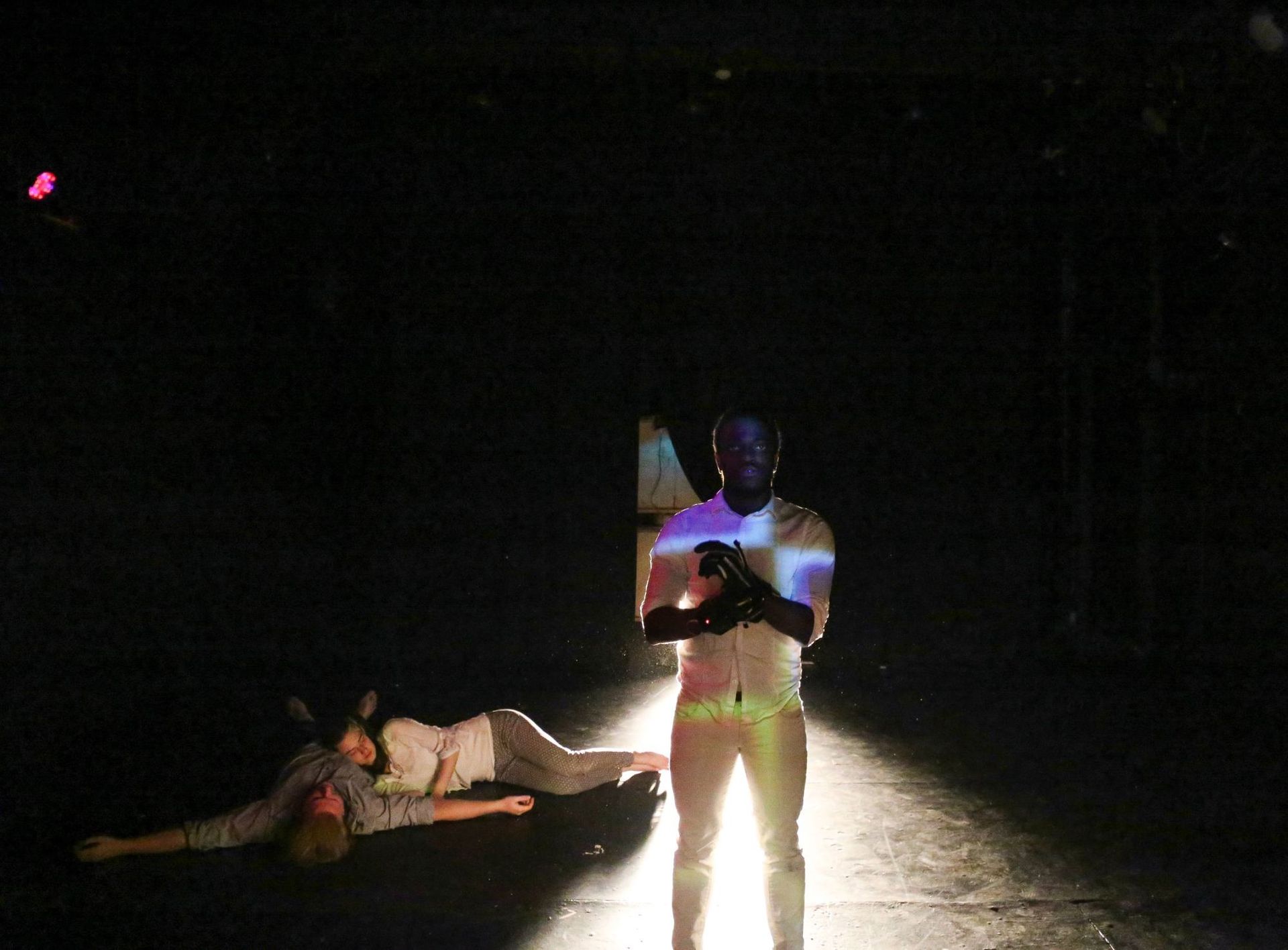 Look/Listen makes use of wearable tech to give the performers direct control over lights and sound, and plays with putting these design elements at the forefront of the story.